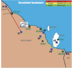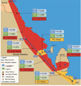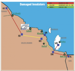 ستون فقرات سیستم های ملی به هم پیوسته GCC یک خط دوبل ۴۰۰ کیلوولت ۵۰ هرتز است که از ۱۷۵۰ برج و ۸ پست فرعی مرتبط تشکیل شده است. این خط در ۹۰۰ کیلومتری جنوب از کویت و از طریق عربستان سعودی به بحرین با استفاده از یک جفت کابل زیردریایی ۴۰۰ کیلوولت اجرا می شود. به قطر ، امارات و عمان ادامه مییابد. شرایط خدمات این خط و در حقیقت بیشتر سیستم های به هم پیوسته سخت است ، با قرار گرفتن در معرض مداوم آب و هوای بیابانی همراه با آلودگی دریایی گسترده. همچنین فعالیتهای سنگین صنعتی و پتروشیمی نیز وجود دارد. دمای محیط در منطقه اغلب در طول تابستان از ۵۶ درجه سانتیگراد فراتر میرود، در حالی که رطوبت نسبی ممکن است بعلت نوسانات ۲۵ درجه سانتیگرادی بین روز و شب به ۱۰۰٪ صعود کند. این امر منجر به تشکیل مکرر شبنم در اوایل صبح میشود – یکی از کاتالیزورهای مکانیسم کلاسیک تخلیه الکتریکی آلودگی.