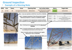 این مشاهدات به همراه عکس هایی که از طرف تیم های بازرسی از این زمینه تهیه شده است توسط یک مدیر پروژه در دفتر تفسیر می شود. سپس ، یک یادداشت اطلاعات (IN) به عنوان اولین زنگ خطای احتمالی ، یا یک اخطار (WN) برای خرابی های فوری یا قریب الوقوع ، ارسال می شود. کارمندان مدیریت دارایی GCCIA می توانند تصمیمات لازم را اتخاذ کرده و برای اقدامات پیشگیرانه یا درمانی مناسب برنامه ریزی کنند.