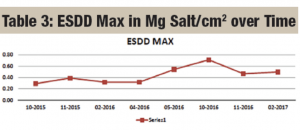 در حال حاضر حدود ۲ سال تخمین منظم از آلودگی سایت (ESDD و NSDD) در مکانهای مختلف در امتداد خطوط دومداره و همچنین ۴ بار در سال در پست آزمایشی وجود دارد. جدا از تجزیه و تحلیل شیمیایی آلودگی های محلول و غیر محلول در عایقها و همچنین از نمونه های خاک، تخمین آبگریزی نیز وجود دارد. اعضای گروه انجام این کار گزارش میدهند که نتایج تاکنون امیدوارکننده است، از نظر اینکه میتوانند کاندیداهای عایق جایگزین با اشاره ویژه به بالاترین سطح ESDD و NSDD و همچنین گرانولومتری شن بیابانی را رتبهبندی کنند. تجزیه و تحلیل شیمیایی آلودگی های جمع شده از سطوح عایق پس از تمیز کردن خود در جدول ۳ ، ۴ ، ۵ ، ۶ و ۷ نشان داده شده است.